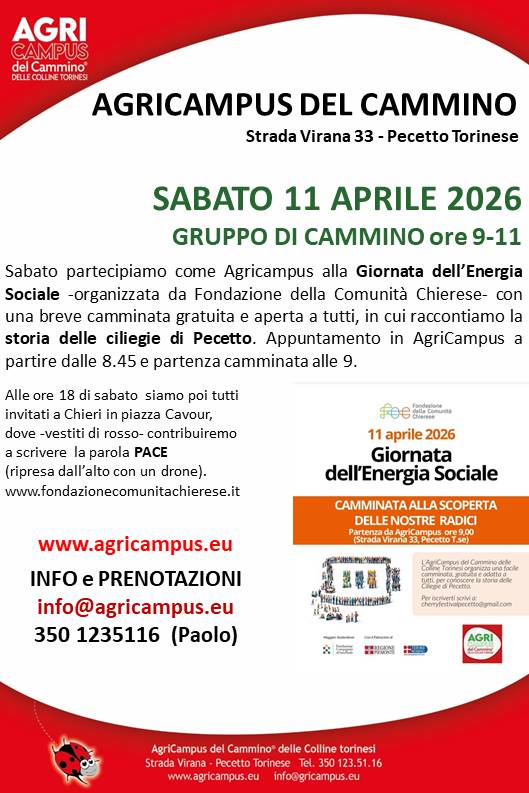 Grandi novità all’Agricampus! Un nuovo gruppo di cammino (gratuito) con orario 9-11, che affianca i gruppi di cammino del mercoledì e giovedì  pomeriggio (ore 14,30-16.30). Ritrovo nel parcheggio di Strada Sabena 33 a Pecetto Torinese, presso la Cooperativa Agricola AgricooPecetto. Si possono anche seguire su prenotazione dal lunedì al sabato corsi di Nordic Walking, escursionismo e tiro con l’arco. Sport per tutti e per tutte le età in quella meravigliosa palestra che è la natura!