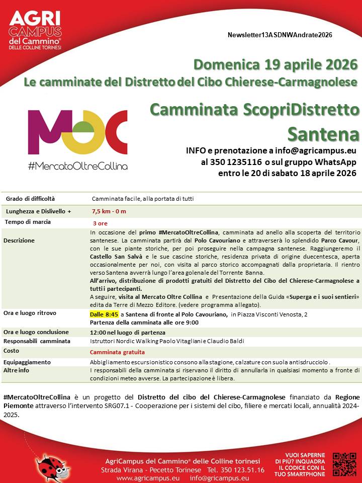 Domenica 19 aprile l’Agricampus organizza a Santena la Camminata gratuita Scopridistretto, con partenza ore 9 dal Polo Cavouriano e arrivo al Castello di San Salvà a Santena. Seguiranno la visita al Mercato Oltre Collina (con omaggio di prodotti del Distretto del cibo Chierese Carmagnolese) e la presentazione della guida Superga e i cuoi sentieri (Terre di Mezzo Editore).